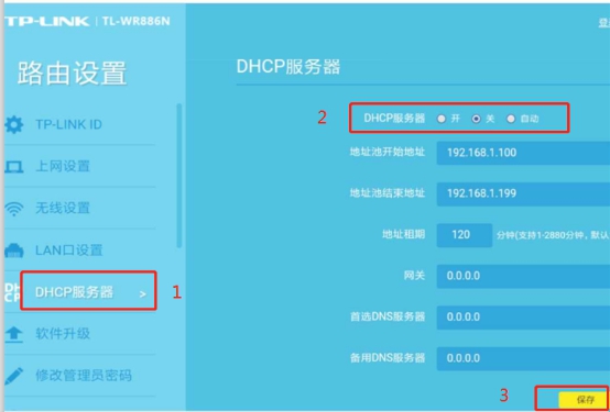 2.在管理页面中找到DHCP服务器,禁用(或关闭)DHCP服务器,点击保存,退出路由器管理后台。
