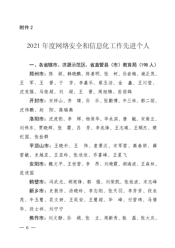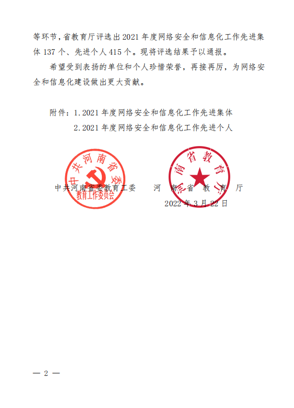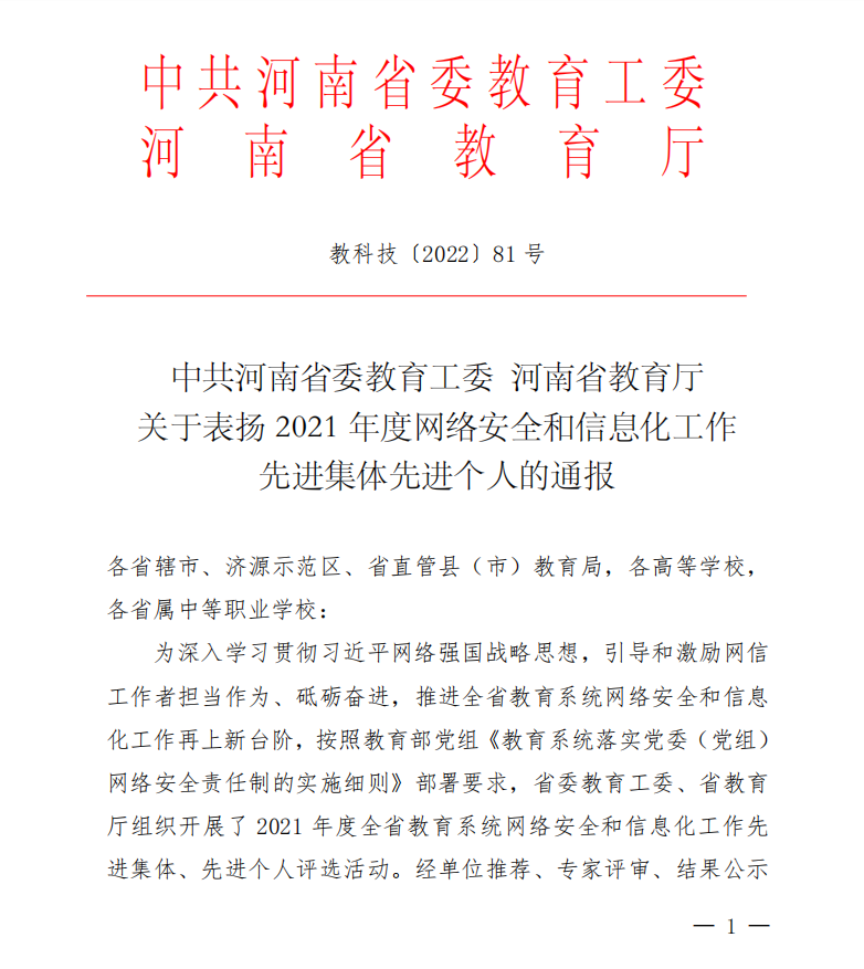 中共河南省委教育工委河南省教育厅关于表扬2021年度网络安全和信息化工作先进集体先进个人的通报