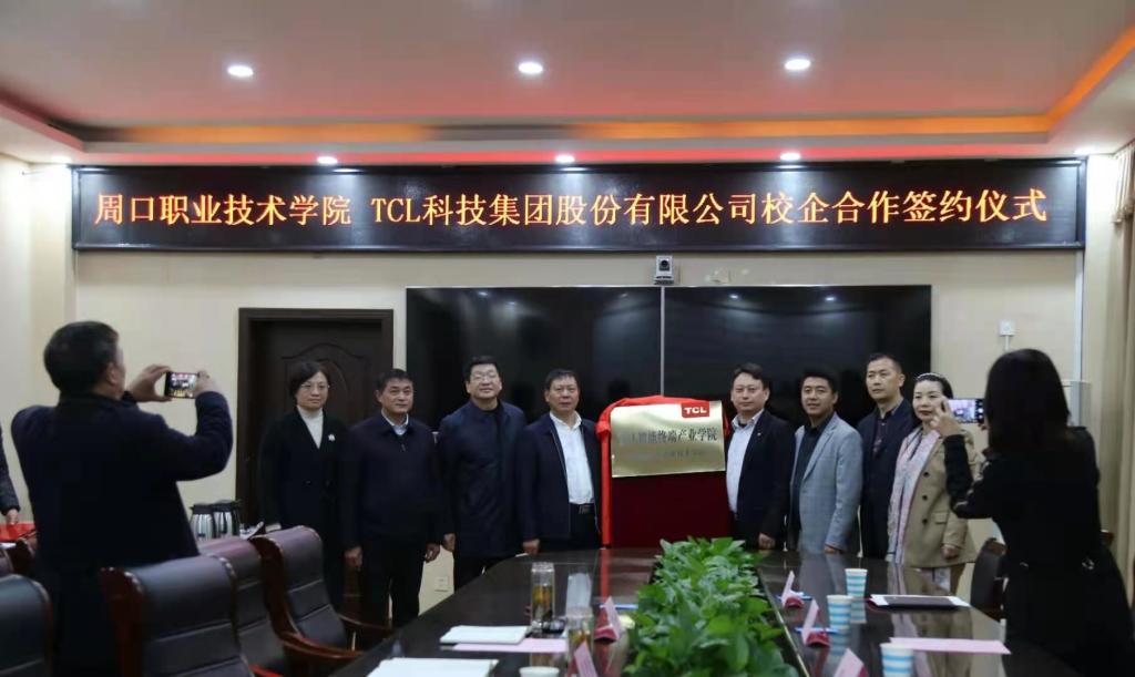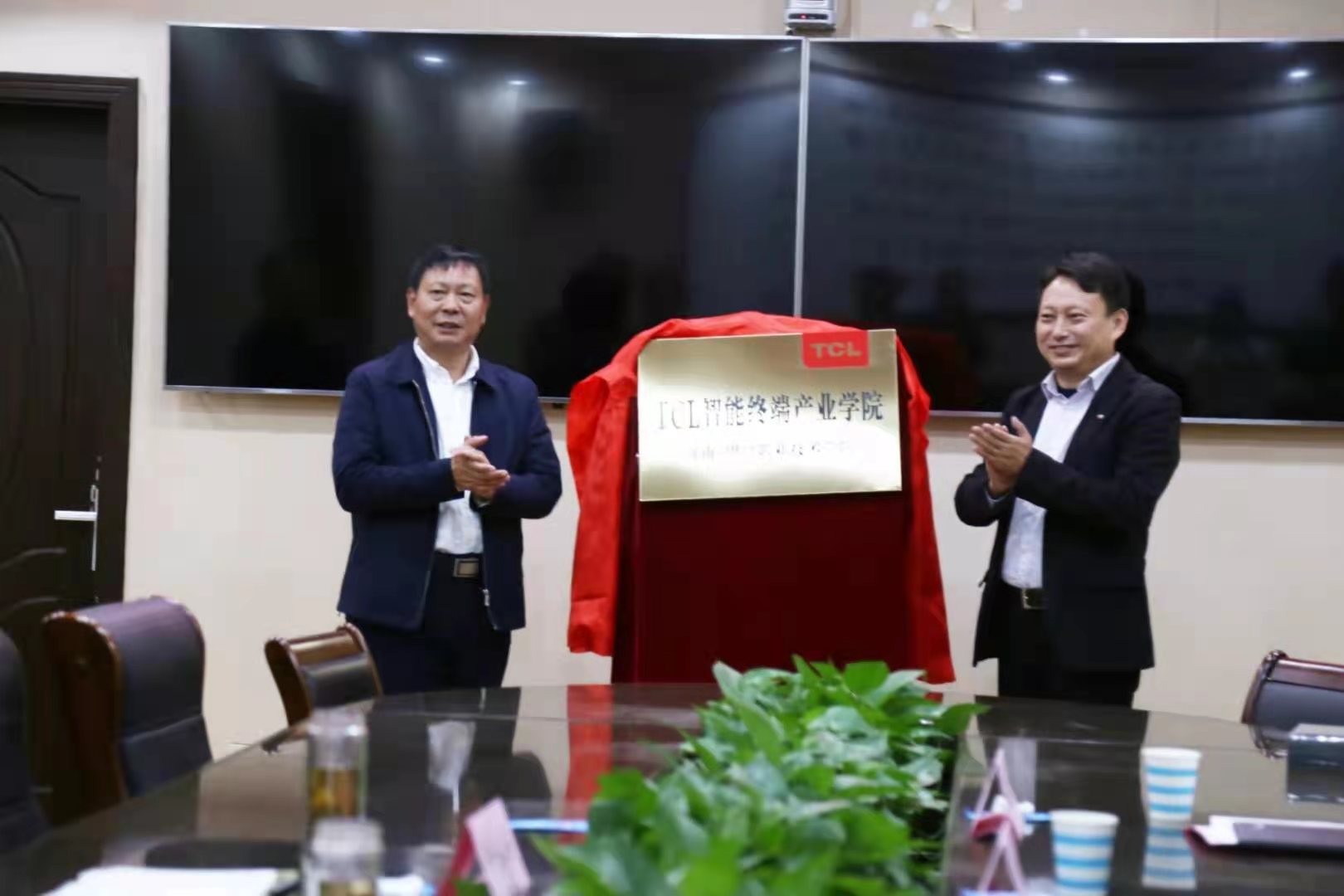 李清臣校长与企业签订了《战略合作协议》,许永安代表学校与企业签订了《TCL智慧产业学院合作协议》,李清臣与庞东共同为《TCL智能终端产业学院》揭牌。
