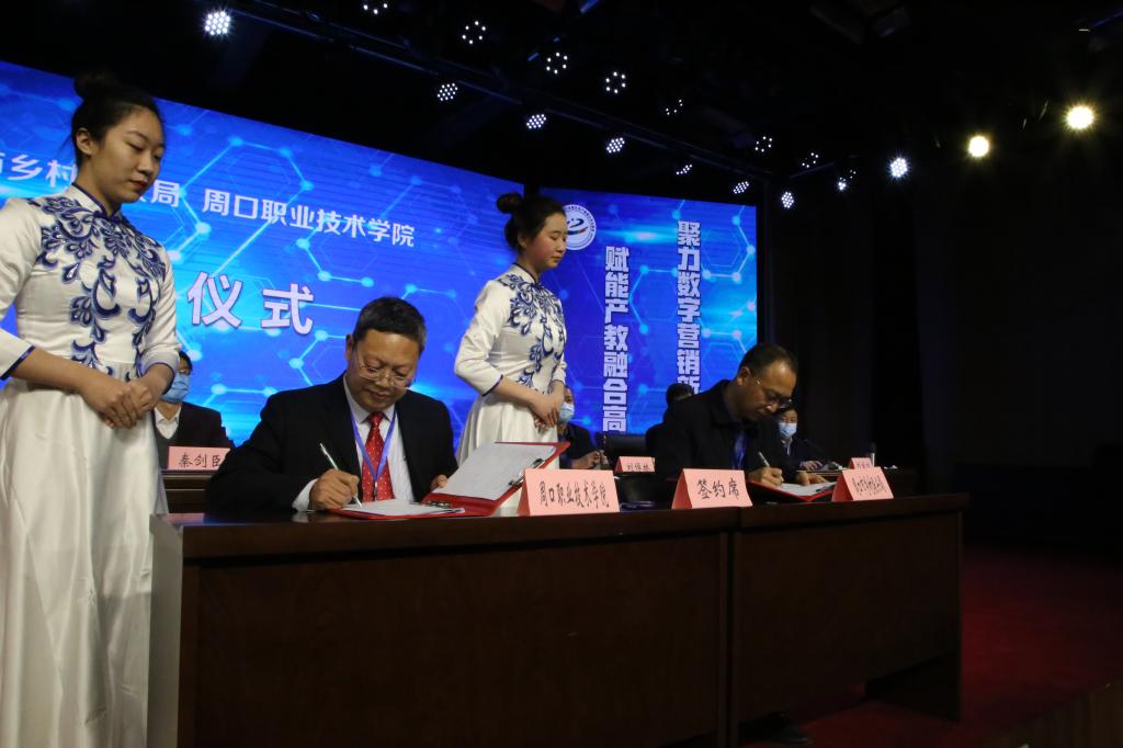 大会还进行了“周口市乡村振兴局与周口职业技术学院战略合作框架协议”、“周口职业技术学院与京东集团共建京东电商产业学院战略合作协议”、“专业联盟与北京巨量引擎网络技术有限公司数字化营销人才培养合作协议”、“周口职业技术学院与北京众木集团共建众木产业学院协议”的签约仪式。