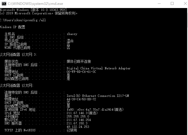 Physical Address : 49-39-C4-50-BB-72 网卡的MAC地址